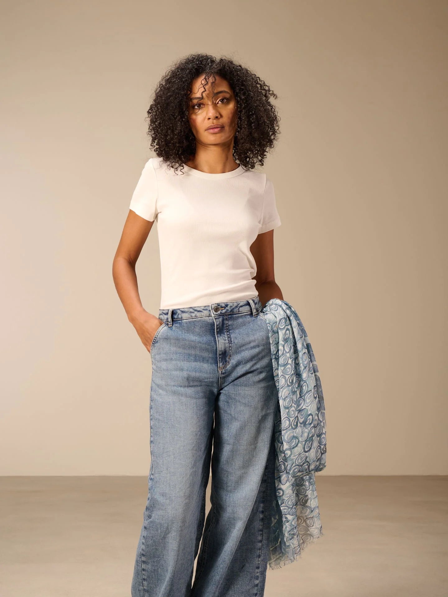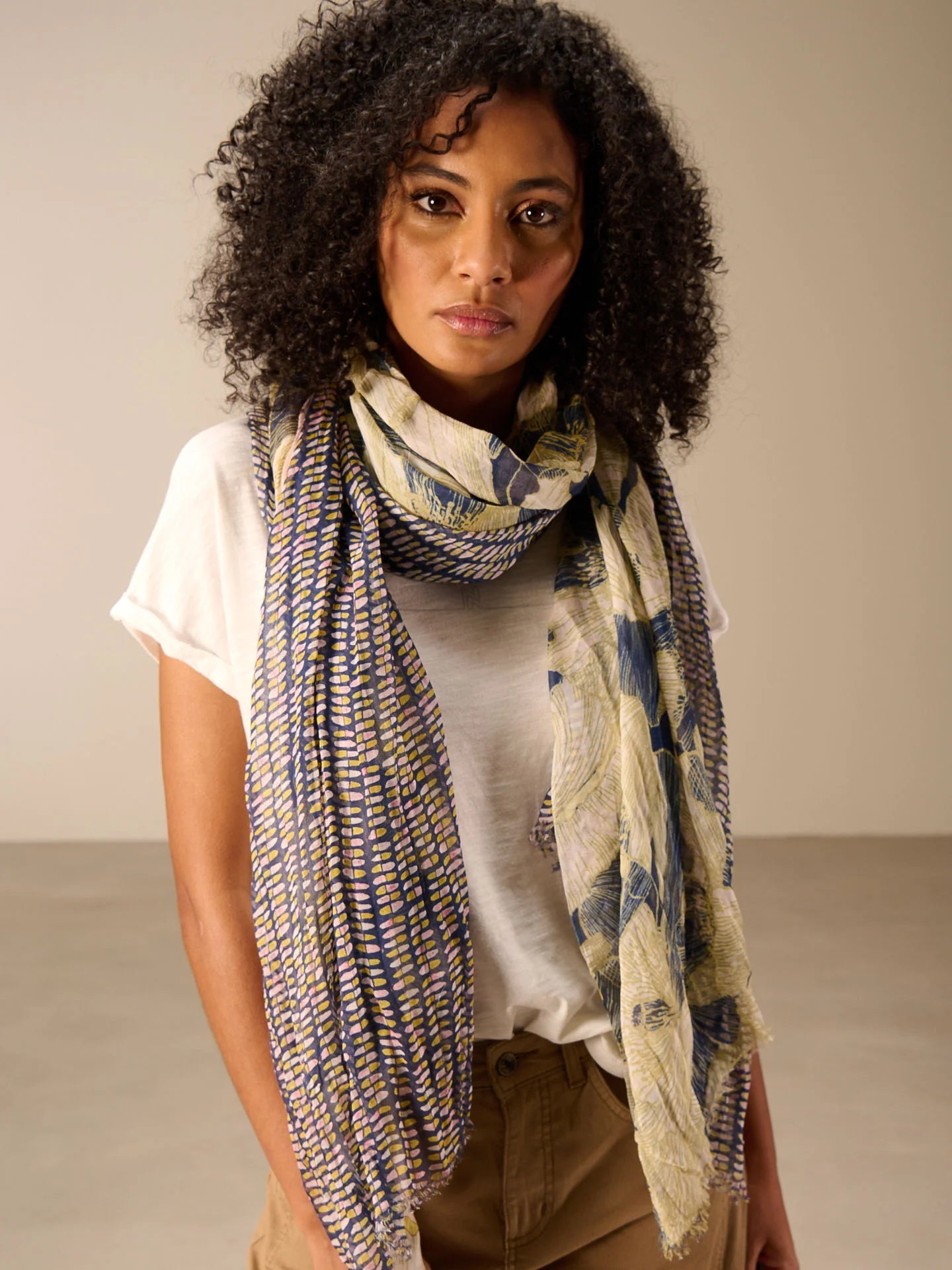 Foulard rectangulaire légèrement transparent avec un imprimé allover et des franges sur le bord le plus court.