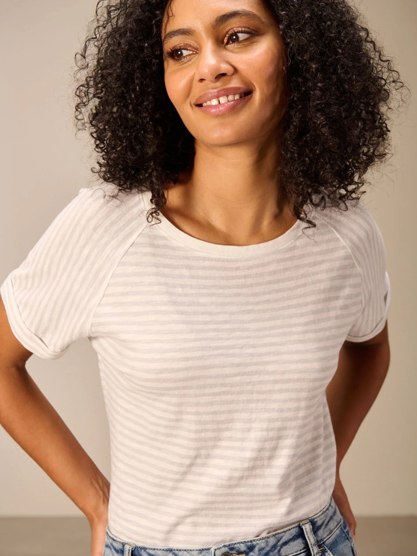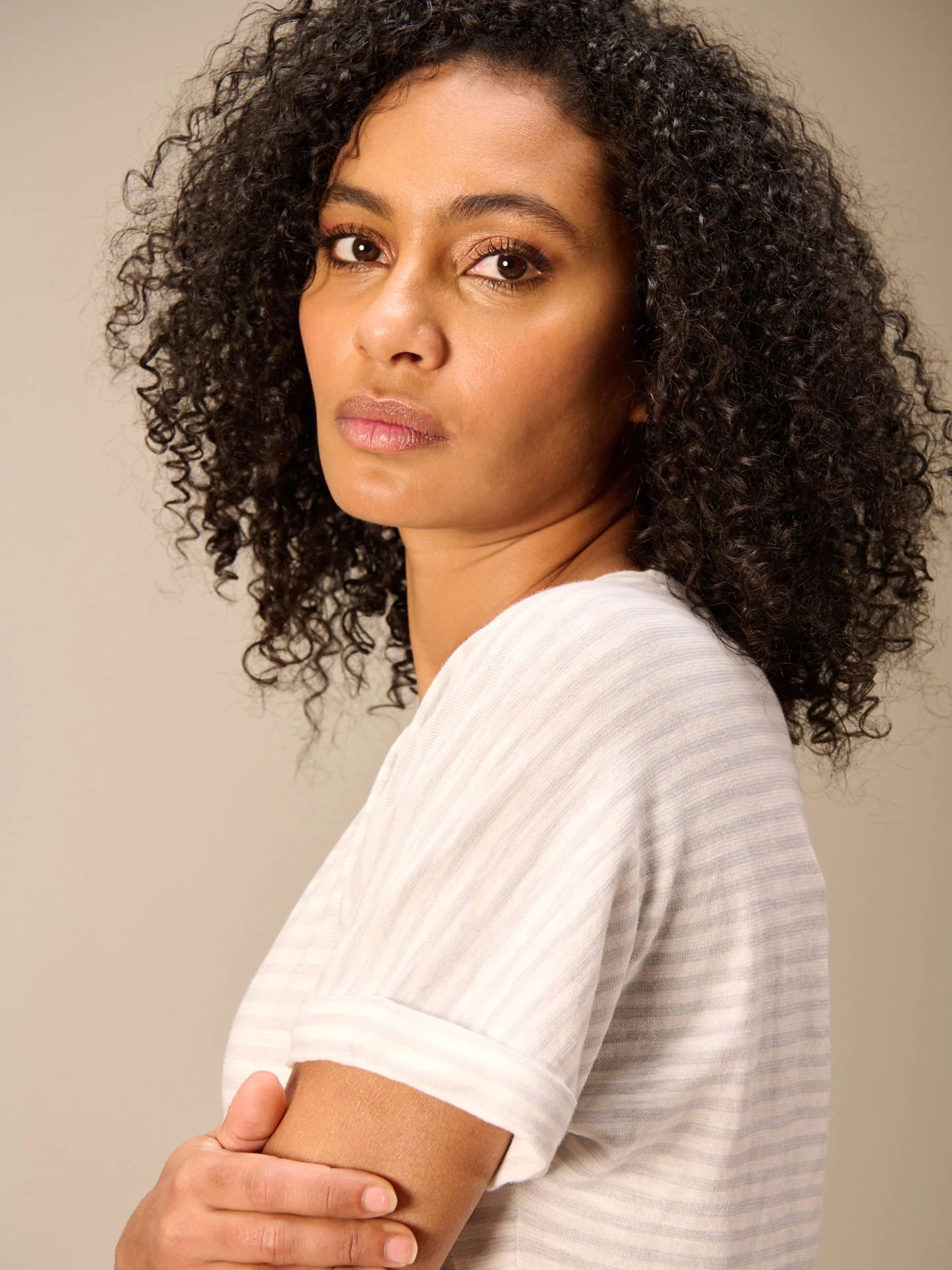 T-shirt ample à manches courtes, motif rayé tricoté, en jersey de haute qualité. Ce t-shirt présente une encolure ronde et des épaules tombantes. La couture décorative dans le dos et les poignets retroussés font de ce t-shirt un vêtement incontournable.