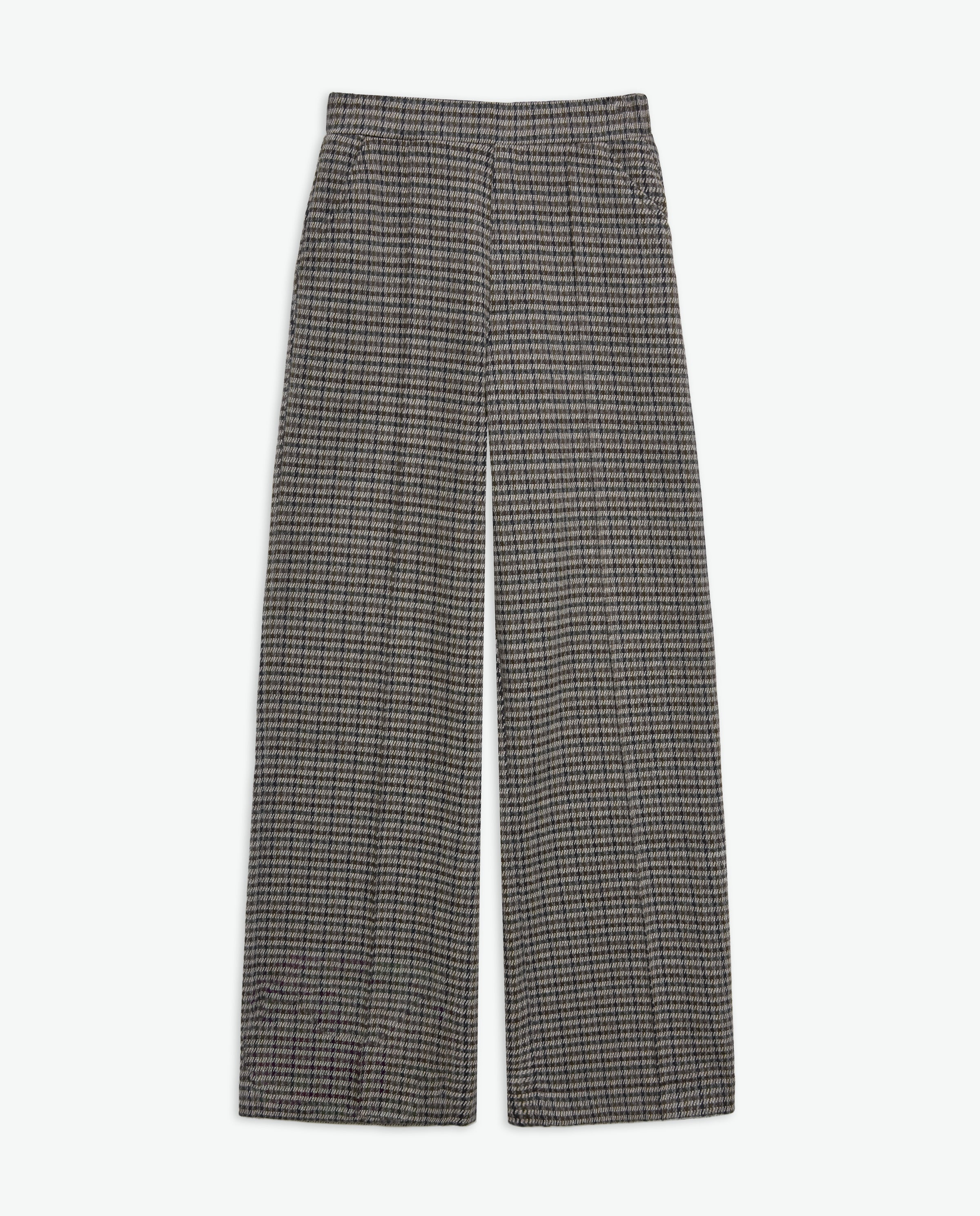 Imprimé jacquard, mélange de gris, khaki et marine. Taille élastique. 2 poches à l'avant.