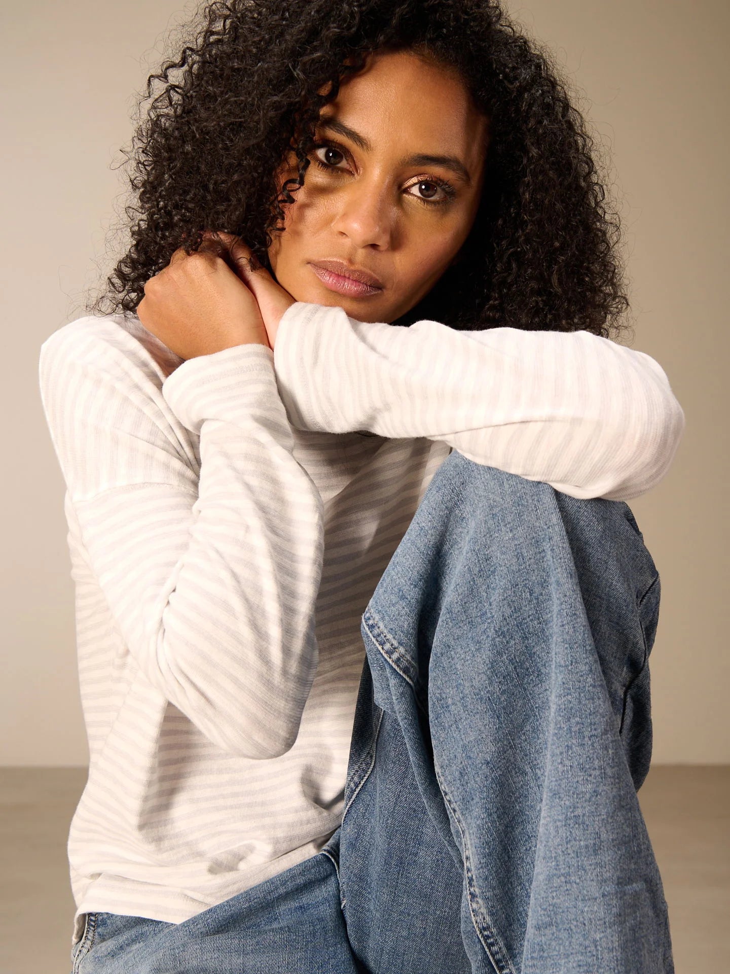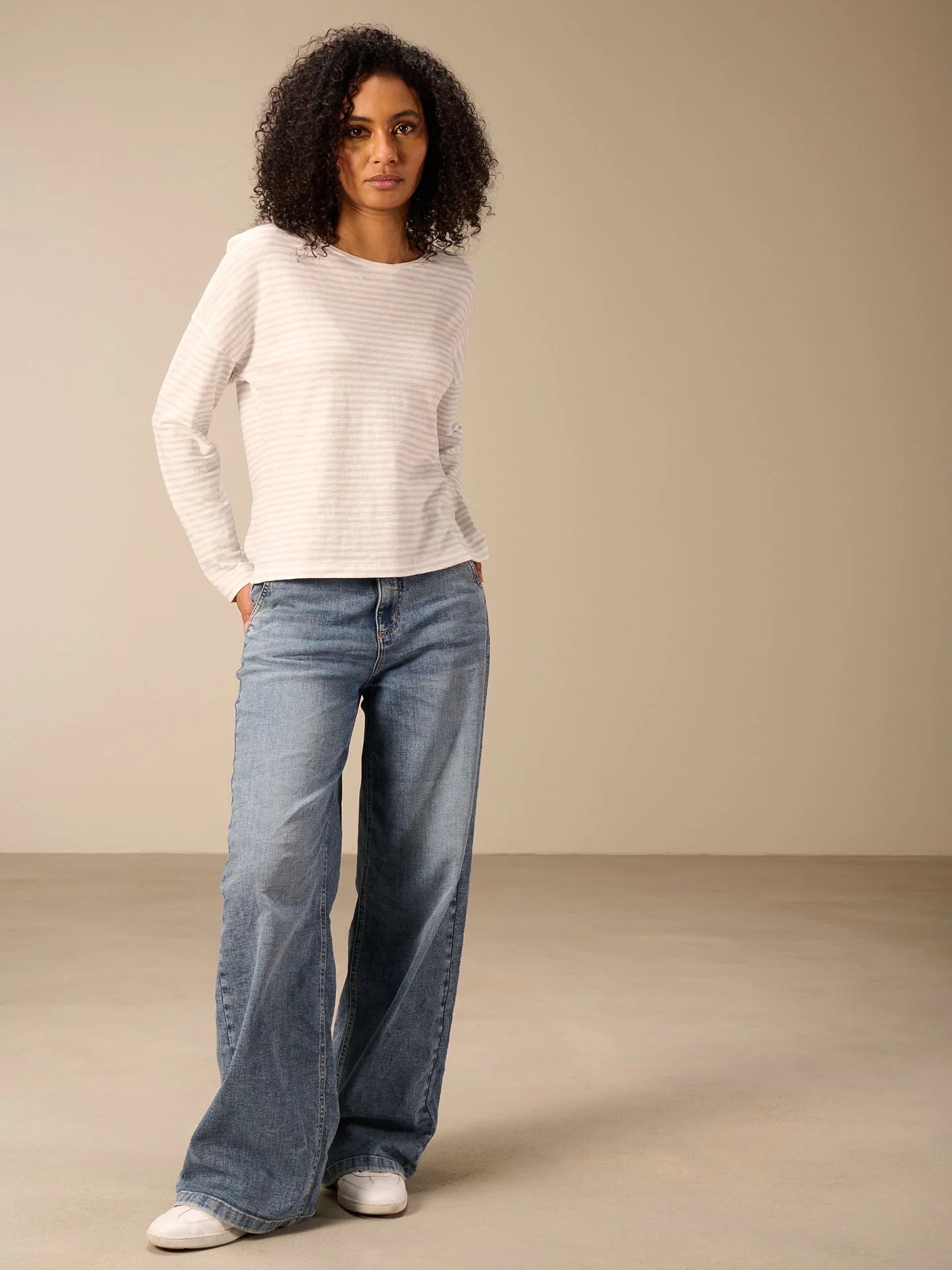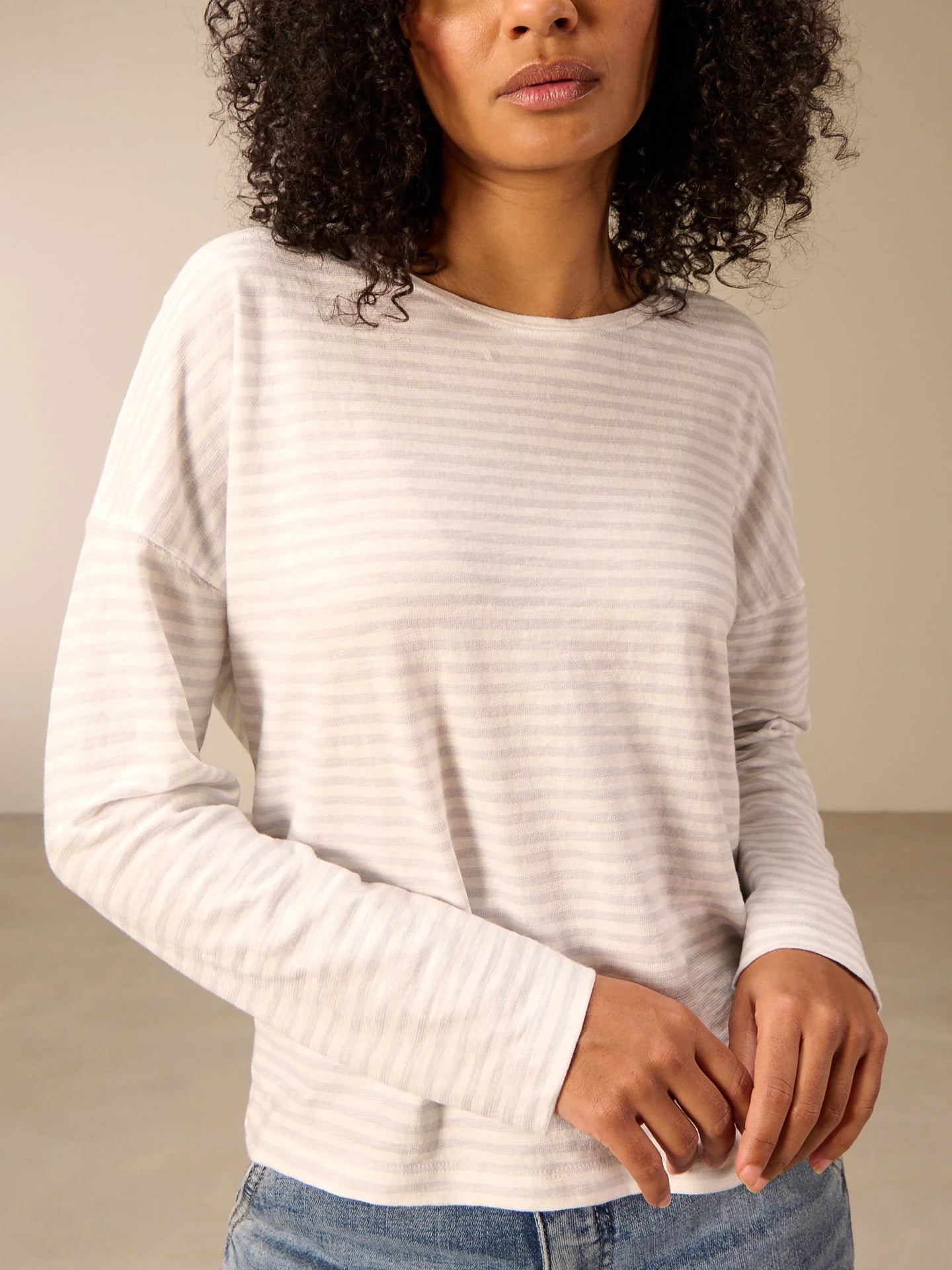 T-shirt à manches longues ample, à rayures tricotées, en jersey de haute qualité. Ce t-shirt présente une encolure ronde et des épaules tombantes. Le jeu des rayures verticales et horizontales dans le dos fait de ce t-shirt un vêtement incontournable.