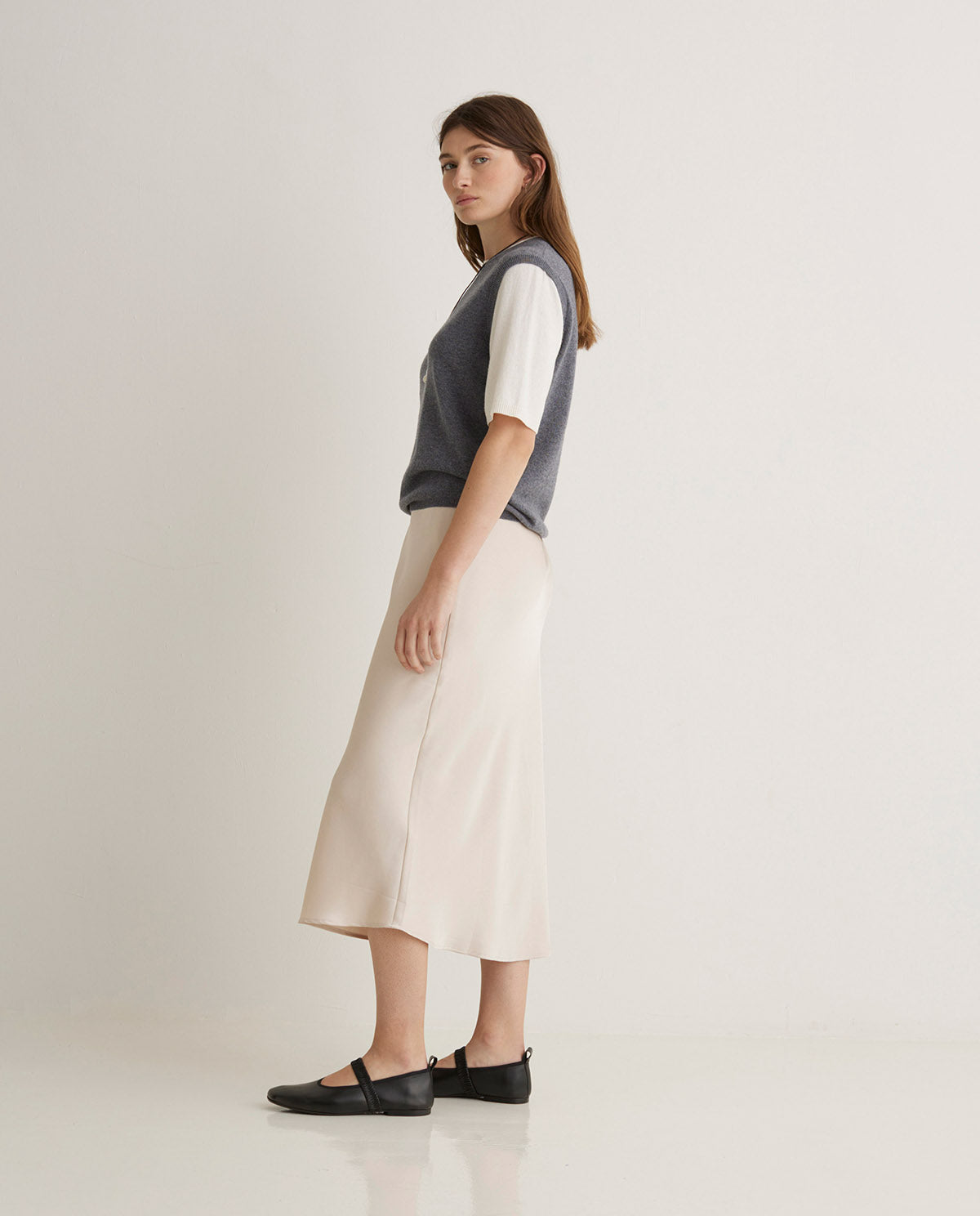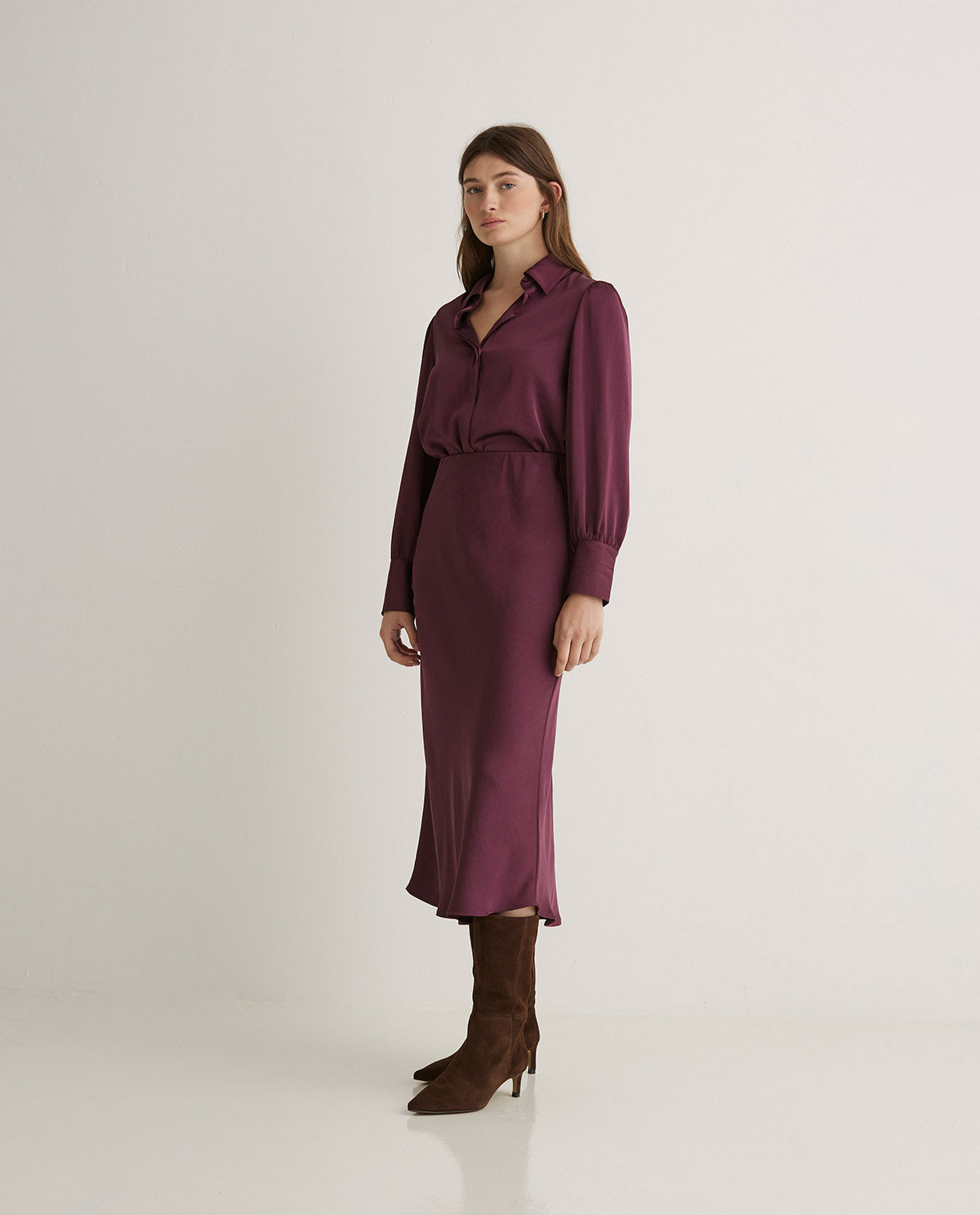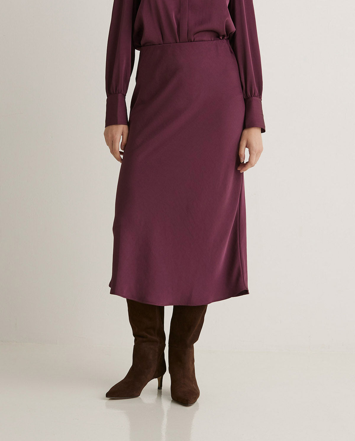 Jupe midi fluide. Tissu de satin. Sans fermeture. Ceinture élastique.