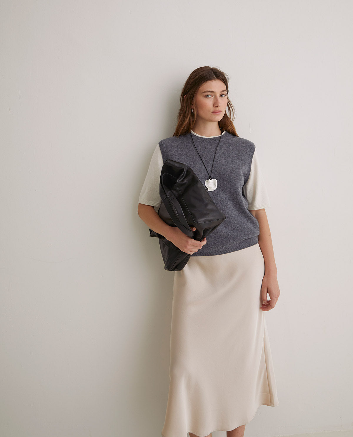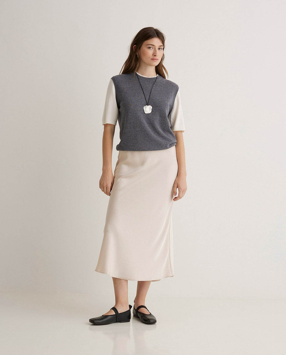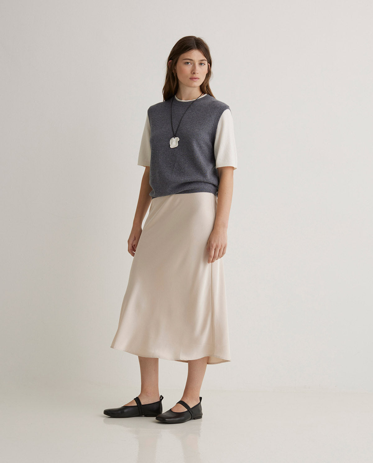 Jupe midi fluide. Tissu de satin. Sans fermeture. Ceinture élastique.