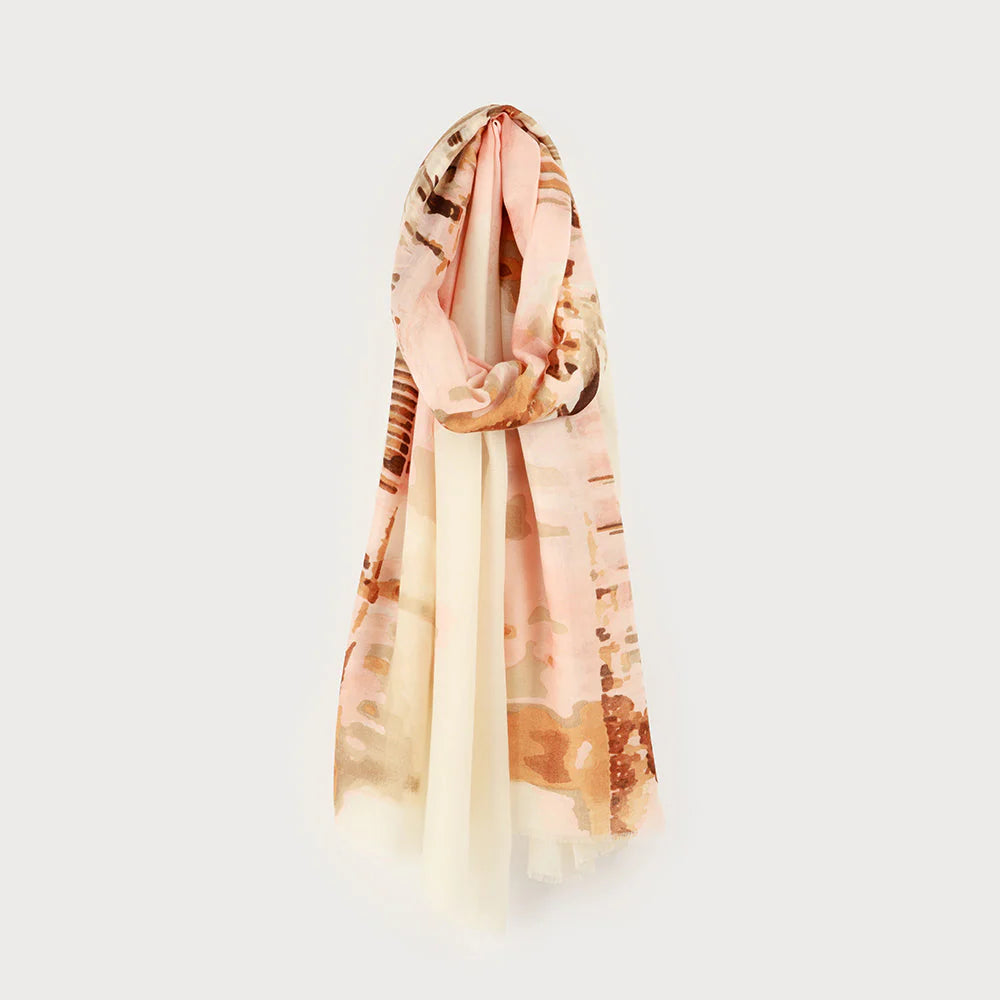 Escape to serene landscapes with this lightweight pink scarf adorned with a beautiful landscape print. It brings a touch of escape to your everyday style.