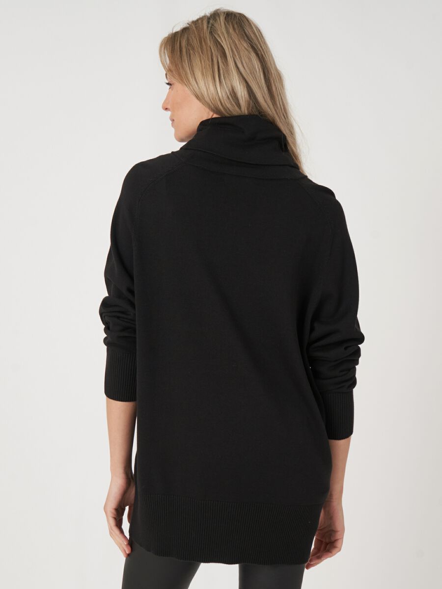 Long fine knit sweater, high turtleneck, long sleeves with ribbed cuffs, ribbed edges.