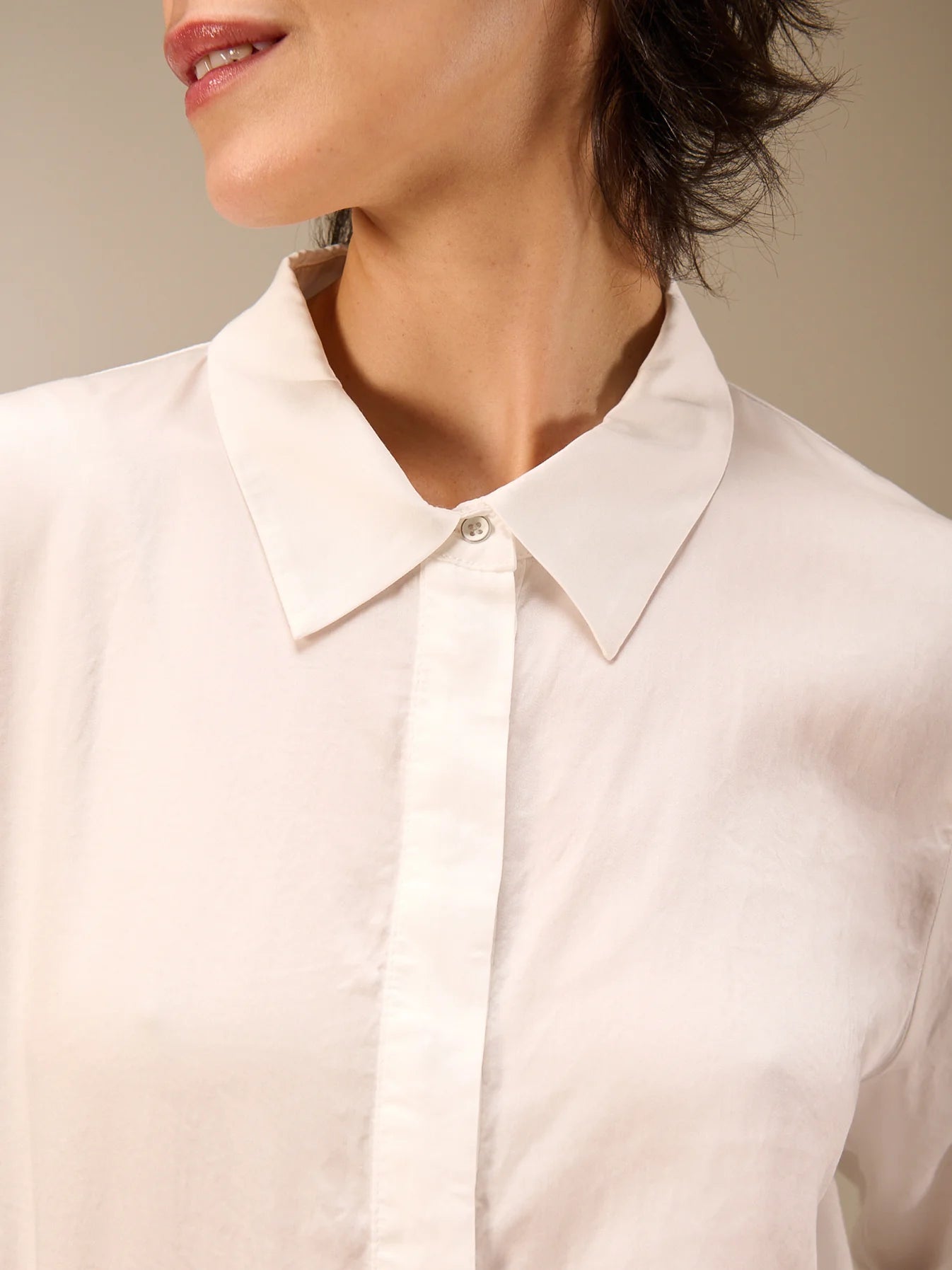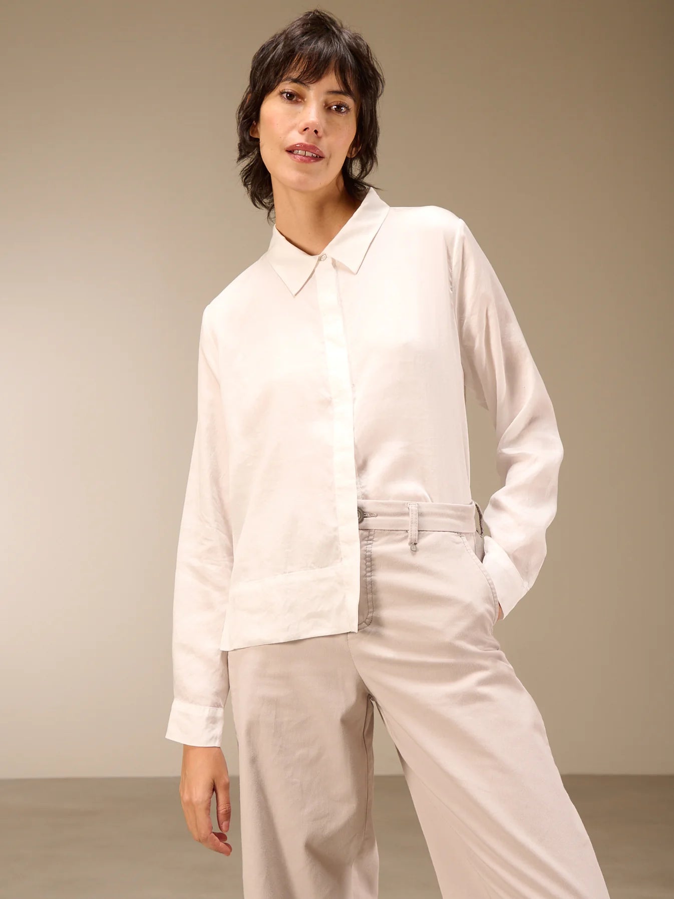Blouse en satin à manches longues, coupe carrée, élégante et chatoyante, avec col chemisier. Les boutons recouverts aux poignets font de cette blouse un vêtement idéal pour les occasions festives.